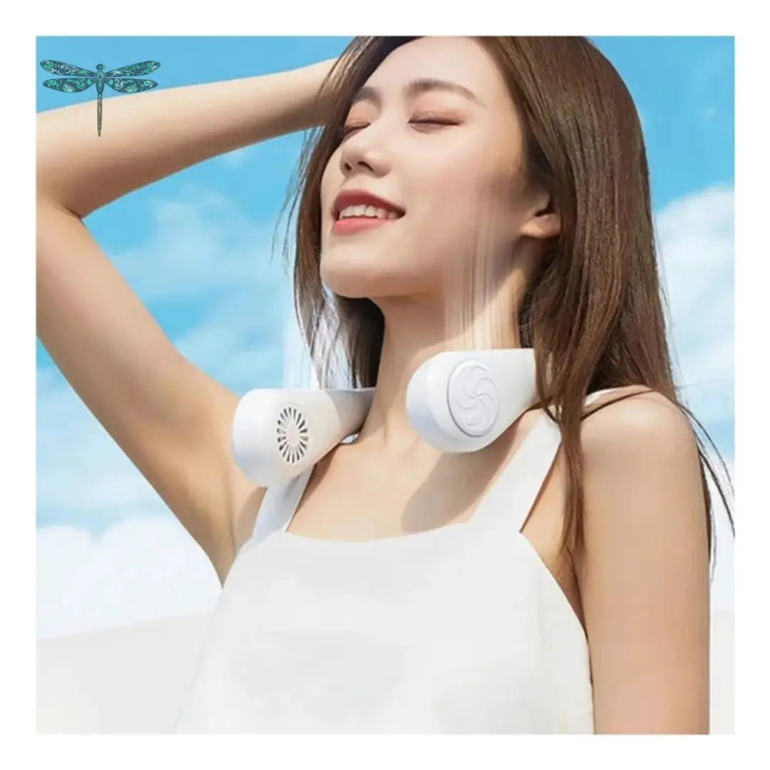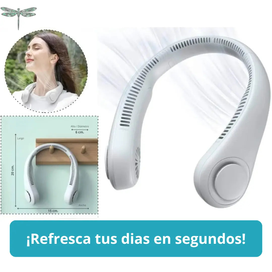 Cómo funciona: Se apoya en el cuello y distribuye aire constante mediante su motor turbo oculto, alimentado por batería recargable (2–3 h) y carga rápida USB.